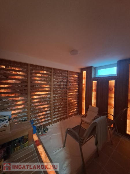 wellness részleg a pinceszinten:egy gerenátorral működtetett sóbefúvókkal felszerelt sóbarlang, egy 12 személyes újszerű állapotú finn szauna, két zuhanyzó, öltözők és két vendégwc, fűtött tepidárium ( kőpad) és pihenőrészleg.