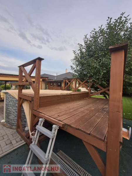 430 m² teljesen parkosított kert automata öntözőrendszerrel , örökzöldekkel, filagóriával, magas ágyással, ellenáramoltatós, hőgenerátoros 3,5 méter átmérőjű, medencével,