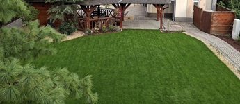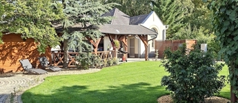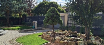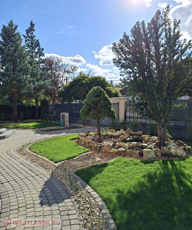 Az udvar öntözőrendszerrel felszerelt, így a sok örökzöld, virág, fű minimális karbantartást igényel. 10-15 növényeket, fákat megvilágító kerti lámpák az esti kerti sétákhoz. Sziklakert és vízköpő egyik és másik végén az udvarnak, hogy garantált legyen a kerti öröm. A kinti grillezőn, sütni kedvelőknek fedett főző rész füstkivezető üsttel. A dupla garázsban (50nm) wc, praktikus monolit födém jó belmagasság padlástér plusz tárolási lehetőség.