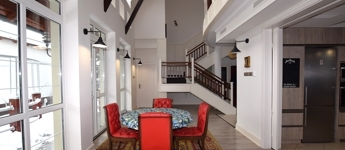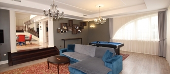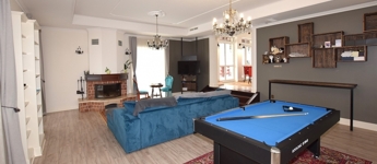 Földszinten található egy tágas nappali kandallóval, biliárdasztallal. Hatalmas étkező-konyha, mely elszeparálható igény szerint. A nappalin kívül van egy szintén tágas szivarszoba, mely használható társalgónak, irodának egyaránt vagy éppen egy külön lakrésznek is.