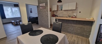 Győr kedvelt városrészében Ménfőcsanakon egy csendes mellékutcában hosszú távra kiadó ez a teljesen felújított 82 m2-es családi ház ami egy 450 m2-es, teljesen körbekerített telken található. A nappali + egy hálószobás, szigetelt műanyag ablakos házban a fűtés kondenzációs kazánnal megoldott, minimális rezsivel fentartható. A kádas fürdőszoba, illetve külön helyiségben a wc szintén újszerű állapotú. Az azonnal birtokba vehető ingatlan bútorozott, gépesített (elektromos főzőlap és sütő, hűtő, mosógép), illetve a nappaliban még tv is található. A házhoz tartozik két fedett terasz és egy 15 m2-es garázs. Dohányzás a házon belül nem megengedett, ill. állat nem hozható!