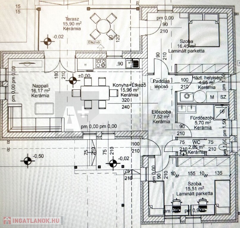 A ház központi tere a tágas nappali amerikai konyhával és étkezővel, melyből közvetlen kijárat nyílik a 15,9 m²-es fedett teraszra.