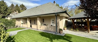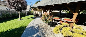 A telek területén a tulajdonosok kimagasló ízlésének köszönhetően kialakításra került egy egyedi nagy létszámú családi összejövetel részére megépített kerti fedett kiülő.