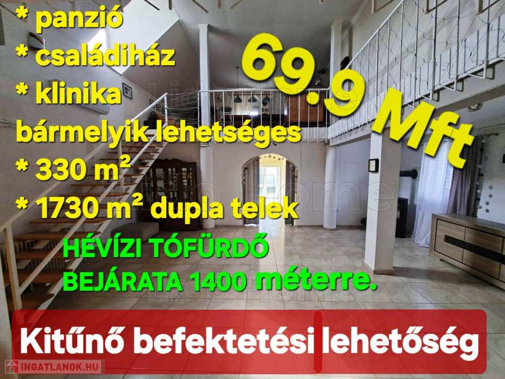 Kétszintes, több külön bejárattal rendelkező, 9 szobás, teraszos családi ház, a Hévízi tótól mindössze 1400 méterre eladó. A házban jogilag és fizikailag is lehet két lakásos társasházat kialakítani:150 és 140 nm-es alapterülettel.