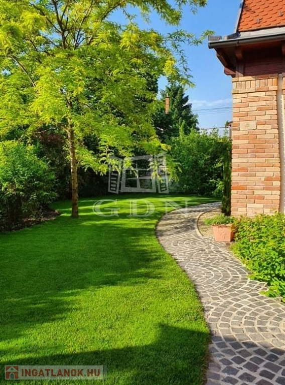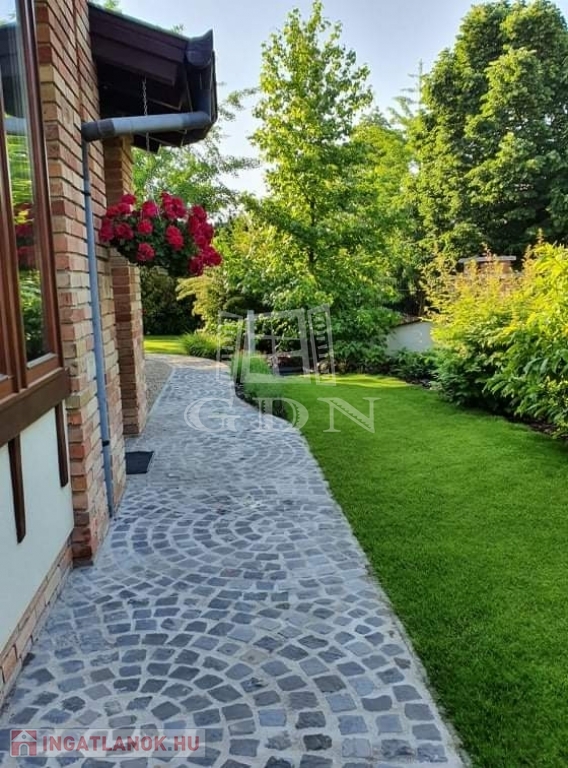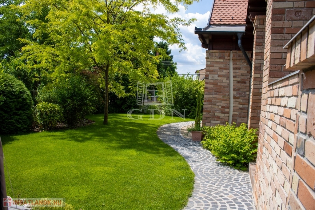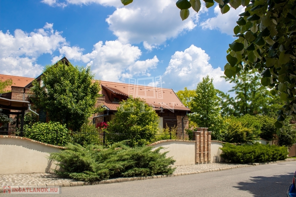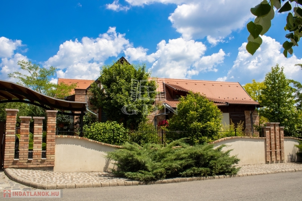 Szakaszoltan is működő riasztó és a zárt, elektromos kapu őrzi az otthon békéjét, mind az aszfaltozott, mind pedig a Viacolorral fedett, fekvőrendőrrel ellátott utca felől.