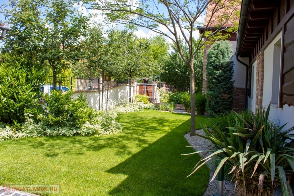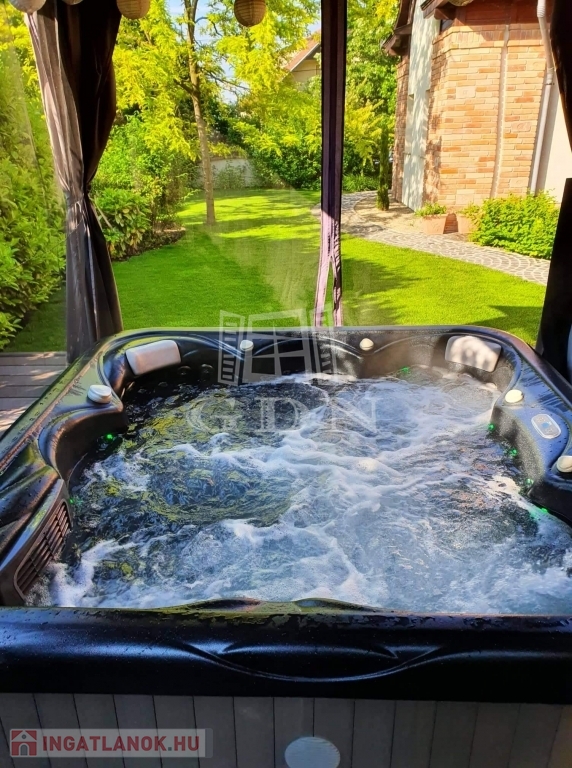 Az ellazulásról a fedett jakuzzi gondoskodik, míg a nyári napozást a parkosított kertben lehet élvezni, melynek locsolásáról automata, fúrt kútról működő locsoló rendszer gondoskodik, a beépített vízlágyító rendszer pedig a selymes, lágy vízért felelős.