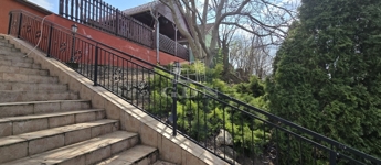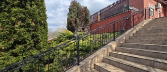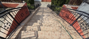A felső és alsó udvarrészt egy hosszabb, karakteres lépcsősor köti össze, amely egy zöld, fásított, virágos kertszakaszon halad keresztül, különleges, szinte park jellegű átmenetet képezve a két tér között.