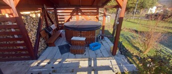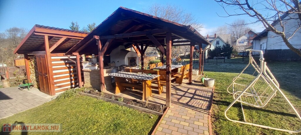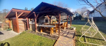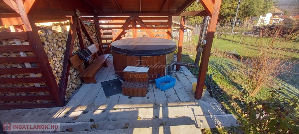 Rendezett, térkövezett udvar, fedett kerti pavilonnal és fával fűthető fürdődézsával, valamint egy hangulatos épített búbos kemencével is rendelkezik.