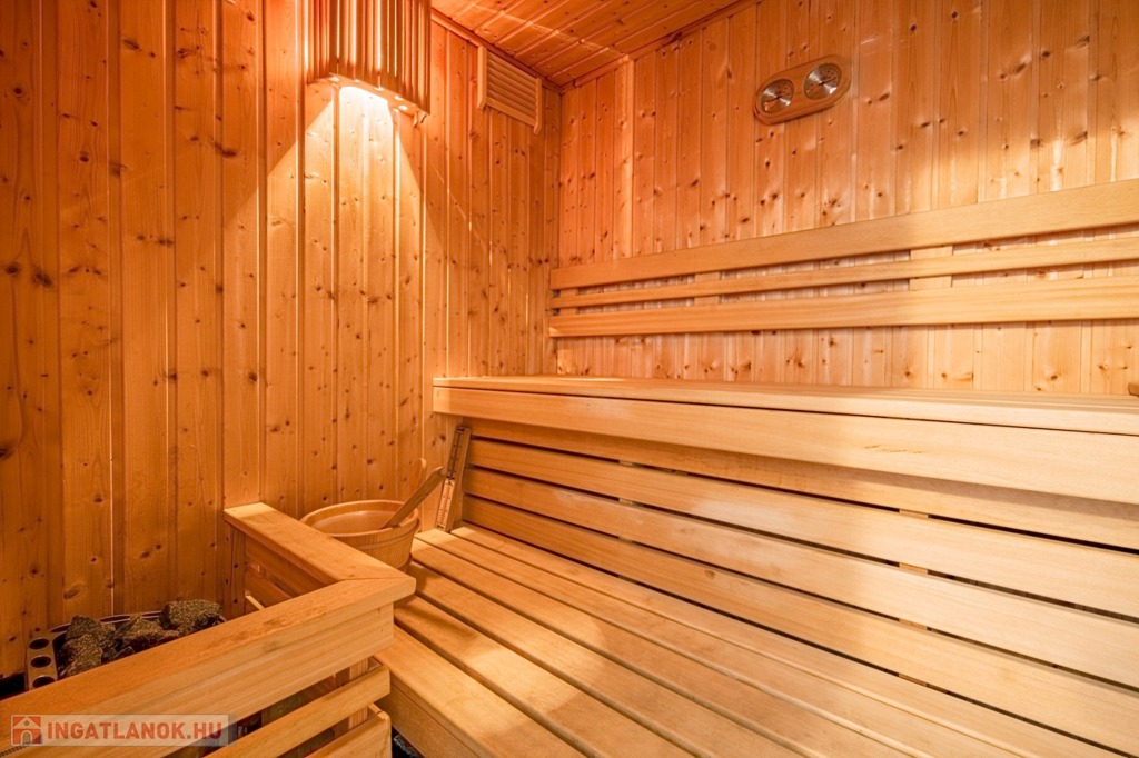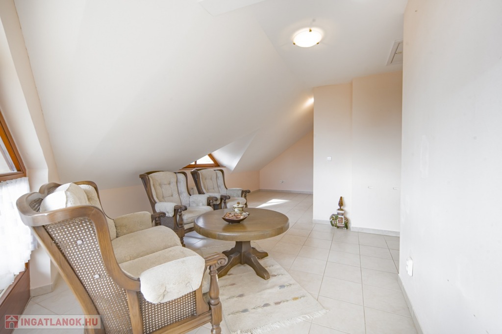 A földszinten egy hálószoba, amerikai konyhás nappali, sarokkádas fürdőszoba beépített szaunával, külön WC és kamra kapott helyet, az emeleten három hálószoba, egy emeleti nappali és egy zuhanykabinos fürdőszoba található.