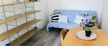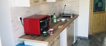 A belső térbe lépve egylégterű konyha–étkező fogadja az érkezőt.