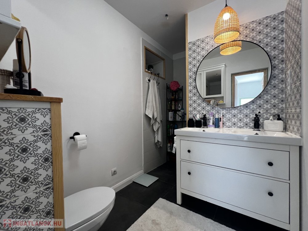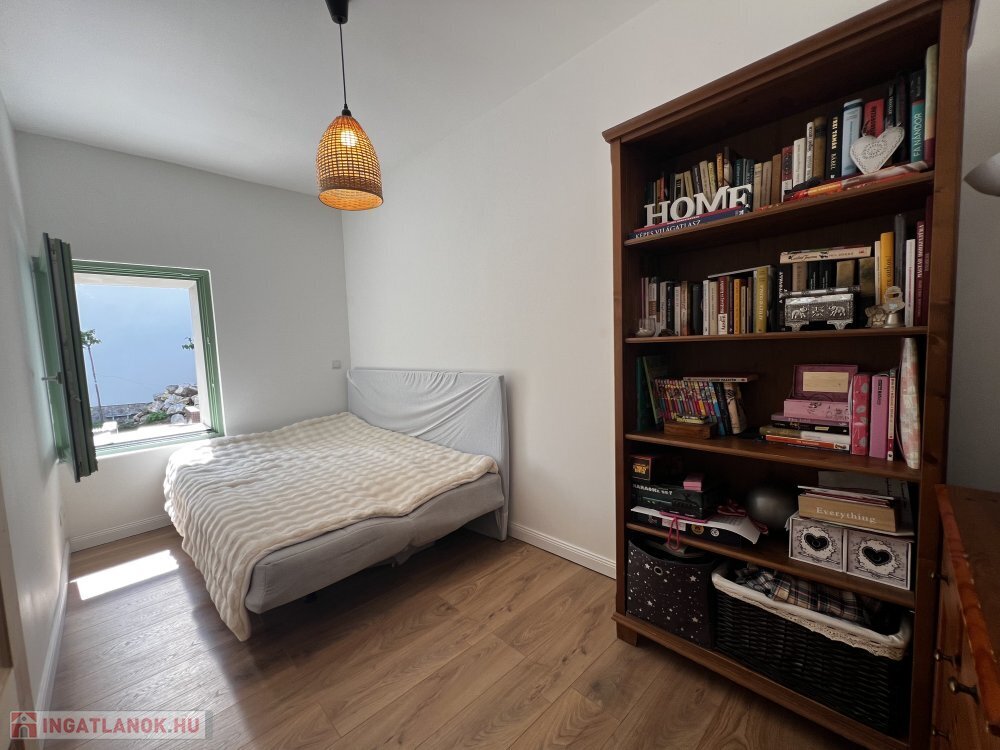 Ugyanezen a szinten tolóajtóval leválasztott hálószoba, egyedi kialakítású zuhanyzós fürdőszoba és praktikus mosókonyha található.