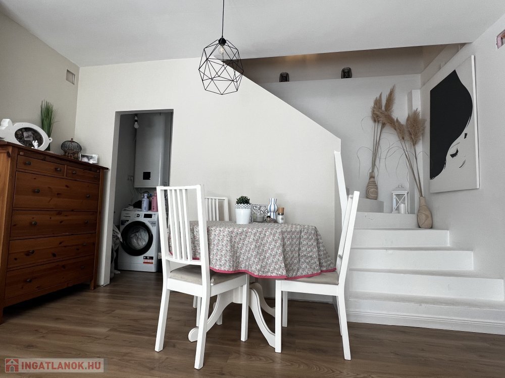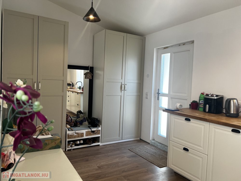 Innen tágas, világos étkező-nappali nyílik, közvetlen kijárattal a részben térkövezett, hangulatos udvarra.
