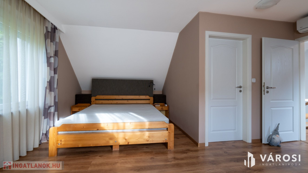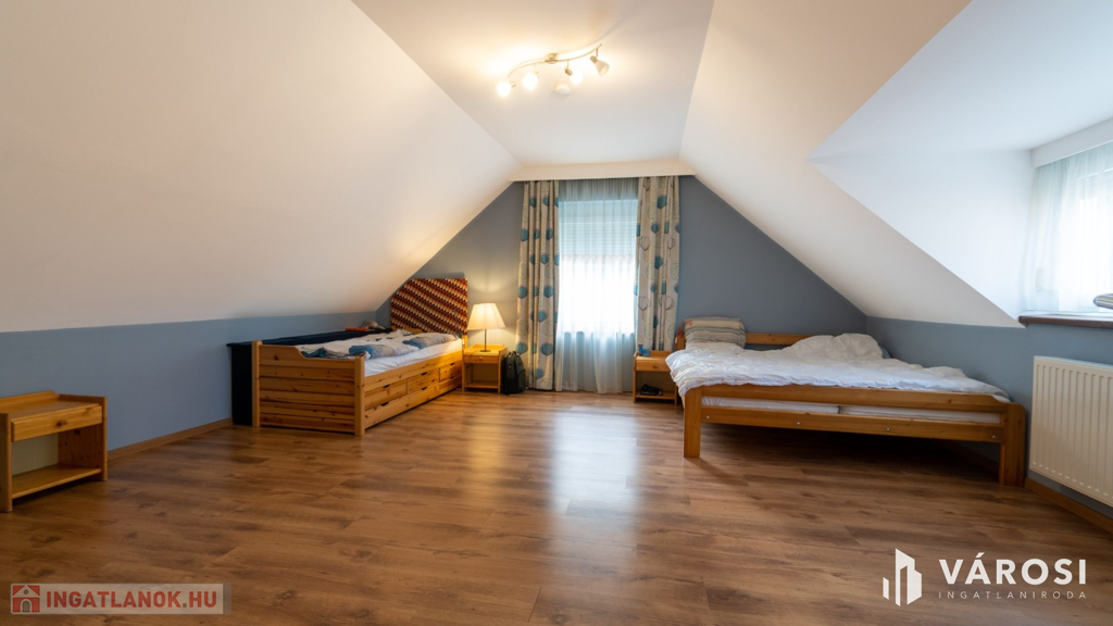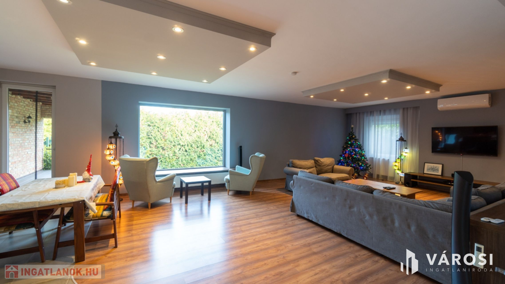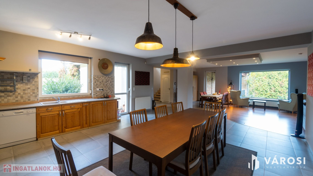 A ház nettó 220 négyzetméteres és egy impozáns 1070 négyzetméteres összevont saroktelekre épült. A földszinten található egy hálószoba saját fürdőszobával, itt kapott helyet a ház központi tere, a 92 m2-es amerikai konyhás nappali, mely garantálja, hogy az egész család és a barátok is bármikor kényelmesen elférjenek. A nappaliból kijárásunk van egy 18 m2-es fedett teraszra. Az utcáról közvetlenül beparkolhatunk a 38 m2-es dupla garázsba, melyből belső átjáróval a mosókonyhába jutunk. Az emeleten található 3 szoba, 2 fürdőszoba, 1 gardrób és 1 közlekedő-nappali.