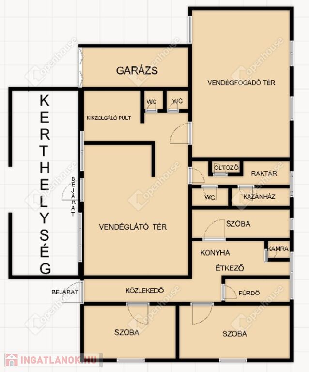 - aljzat burkolat: mázas kerámia, járólap, faparketta Az eladó vendéglátó egység és a családi ház egy épület egység, mely két külön bejárattal az udvari részről közelíthető meg.