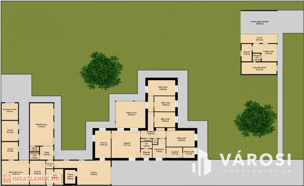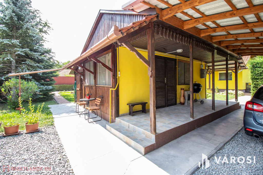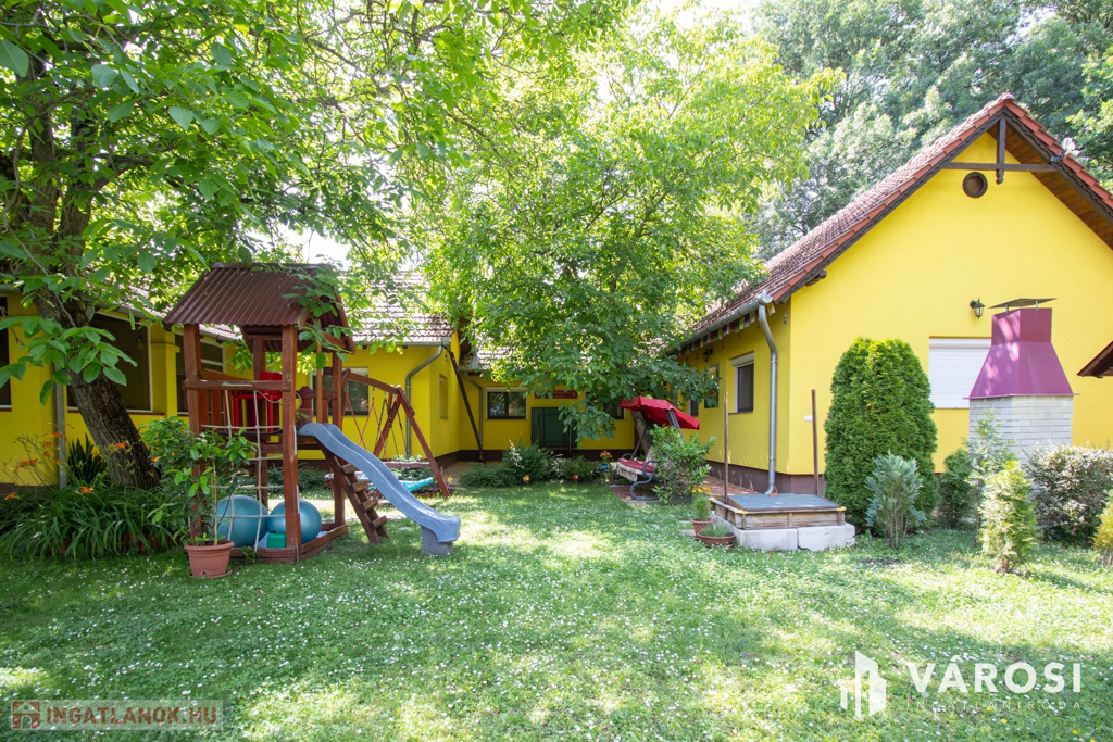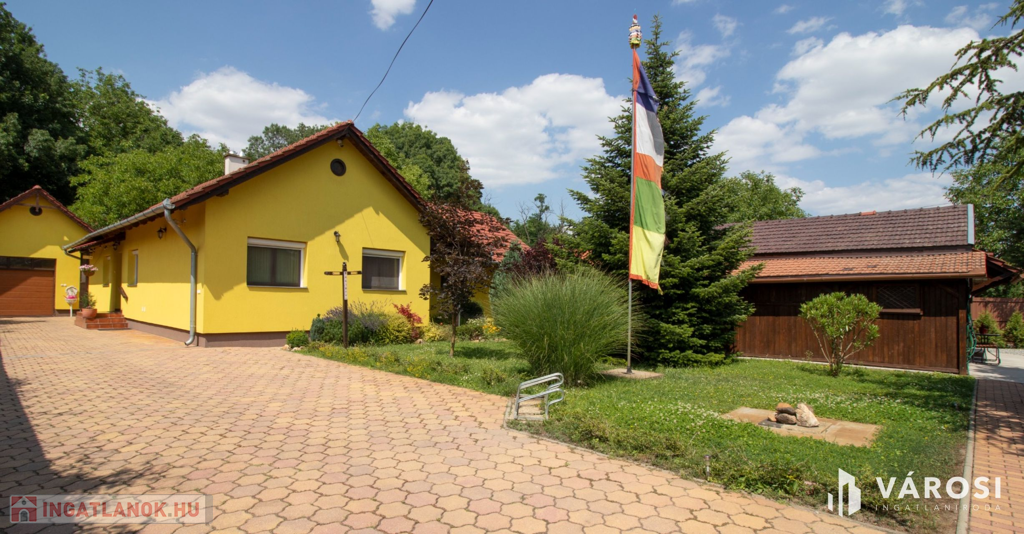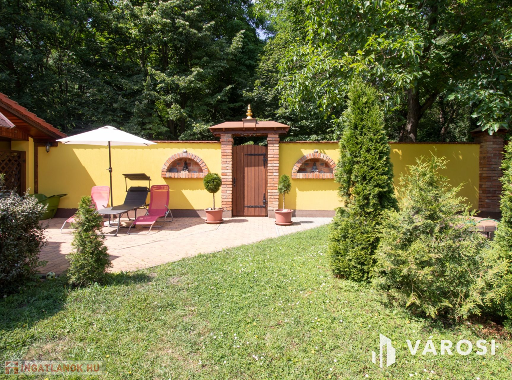 A 1510 m²-es telken gondosan kialakított parkosított környezet várja az új tulajdonost. A hatalmas fenyőfák és a termő diófa nemcsak árnyékot és természetes szépséget nyújtanak, hanem egyedi hangulatot is teremtenek. A kültéri élet szerelmesei számára a kert igazi paradicsom: egy fafaragó mester által készített hangulatos kiülő és grillező teszi még otthonosabbá a szabadtéri időtöltést. A gyermekek számára egy természetes rönk játszótér nyújt önfeledt szórakozást, míg a medencének vagy trambulinnak kialakított térburkolatos rész tökéletes helyet biztosít a családi kikapcsolódásnak. A telken található egy könnyűszerkezetes, felújítandó vendégház is, amely saját konyhával és fürdőszobával rendelkezik, így akár vendégek fogadására vagy külön élettérként is kiválóan alkalmas.