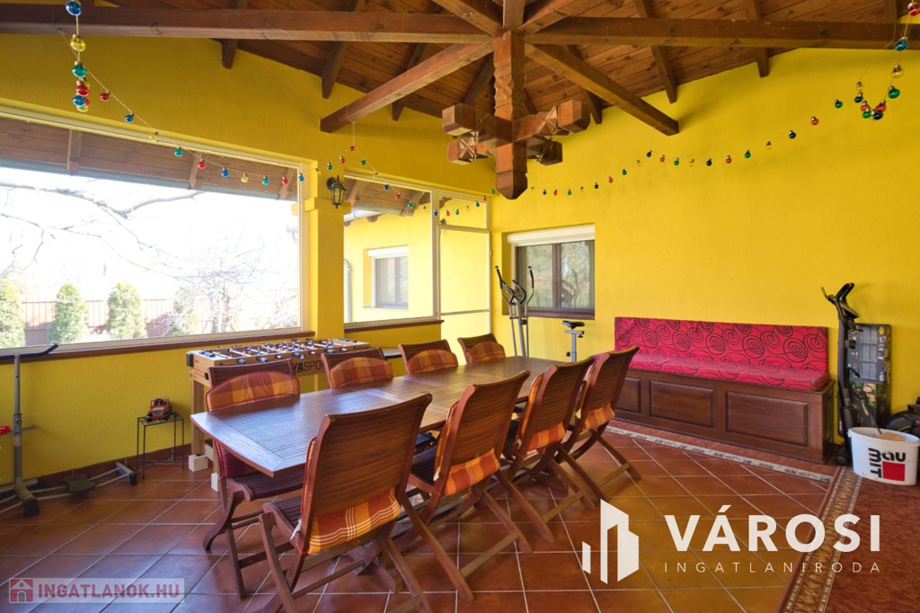 A házhoz tartozik egy 27 m²-es, szúnyoghálózott fedett terasz, amely kiváló helyszíne lehet a nyári reggeliknek vagy az esti beszélgetéseknek. Emellett a telken több egyéb épület is helyet kapott, összesen 167 m²-en, amelyek között található egy garázs, a vendéglakrész konyhával, egy előadóterem, valamint tárolók és egy fedett kerékpártároló is.