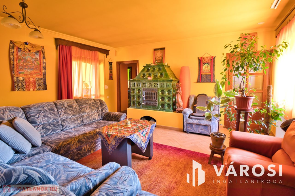 A 2001-ben épült, masszív falazatú, 138 m²-es lakóház melegséget és egyedi karaktert sugároz. A nappali központi eleme az iparművész által tervezett, gyönyörű mázas cserépkályha, amely nemcsak esztétikai élményt nyújt, hanem a hűvösebb napokon kellemes meleget is biztosít. Az épület falai 45 cm vastag téglából épültek, amelyet további 10 cm homlokzati hőszigetelés tesz még energiatakarékosabbá.