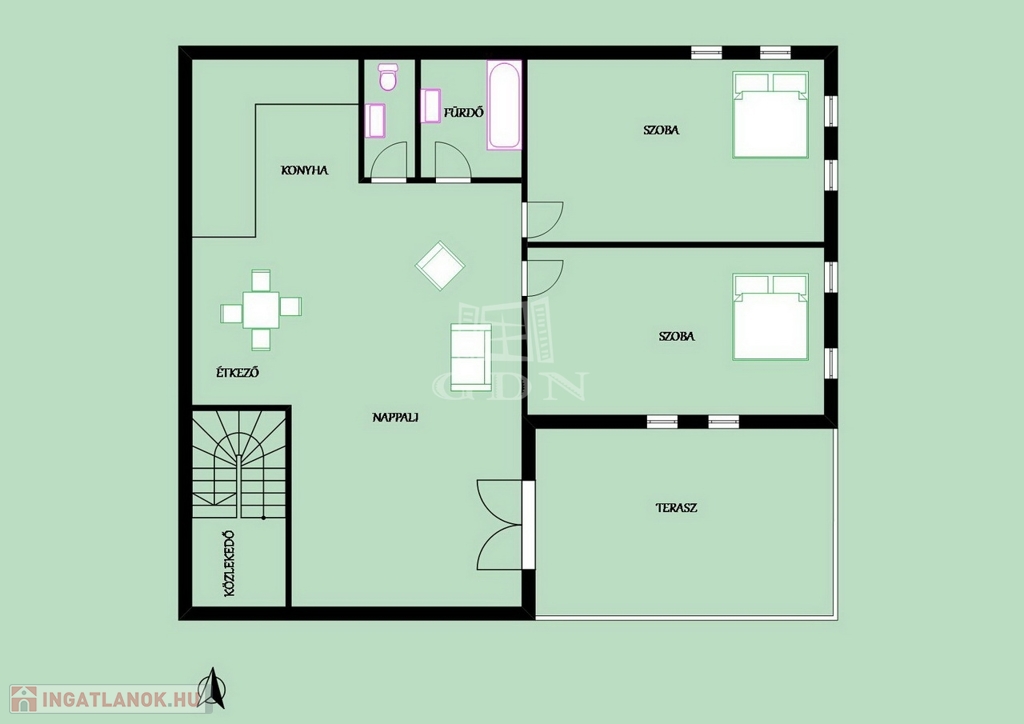 - Két hálószoba, külön fürdő és WC