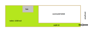 A telek úgynevezett "nyeles telek", az utcafrontról egy keskeny saját úton közelíthető meg az ingatlan. Teljesen körbekerített, az autóbehajtáshoz széles kapuval ellátott.