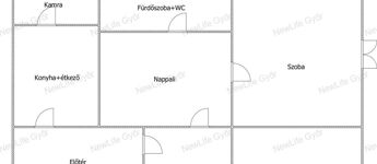 Elosztását tekintve előtérből, konyha+étkezőből, kamrából, előszobából, nappaliból, 2 hálószobából és fürdőszobából áll.