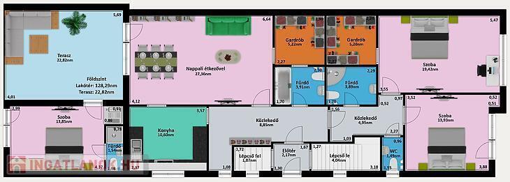 • Földszint: nappali, 2 szoba, 2 gardrób, 1 konyha, 2 fürdőszoba, 1 külön wc található. A nappaliból nyílik egy 24,24nm-es terasz közvetlen kertkapcsolattal.