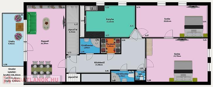 • Emelet: 3 szoba, 1 konyha, 1 gardrób, 2 fürdőszoba, 1 külön wc található. A nagy szobából nyílik egy 19,17nm-es terasz, amely hátsó kertre néz