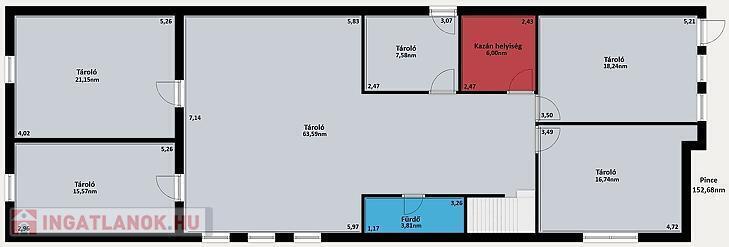 • Pince: 5 ablakos helyiség, 1 kazán helyiség, 1 tároló és egy fürdőszoba található. Ez a szint abszolút alkalmas fitnesz, wellness kialakításra, de irodának vagy tárolásra is kiváló.