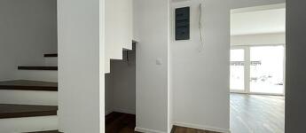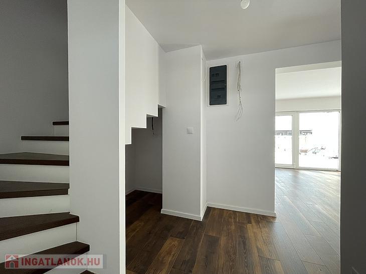 Az elülső 96 m²-es ház jelenlegi elosztása az alsó szinten egy amerikai konyhás nappaliból, egy szobából és fürdőből, a felső szinten pedig 2 és 1 félszobából, valamint egy fürdőből áll.