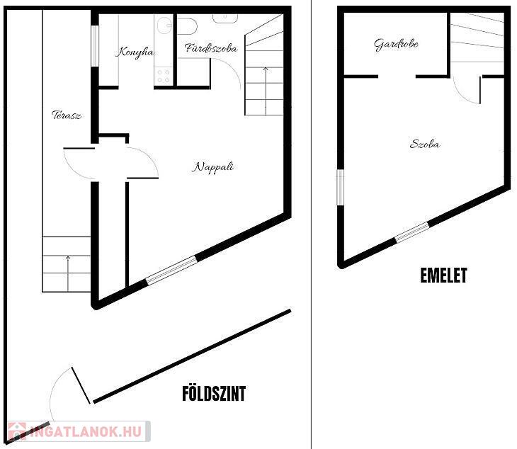 Az ingatlan 2 szintes elosztású, a földszinten a nappali, konyha és a fürdő található, az emeleten pedig egy tágas szoba gardróbbal.