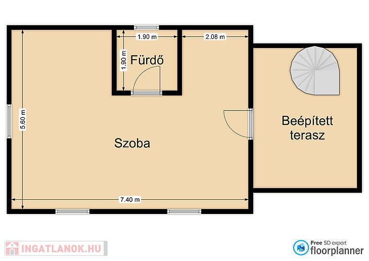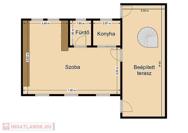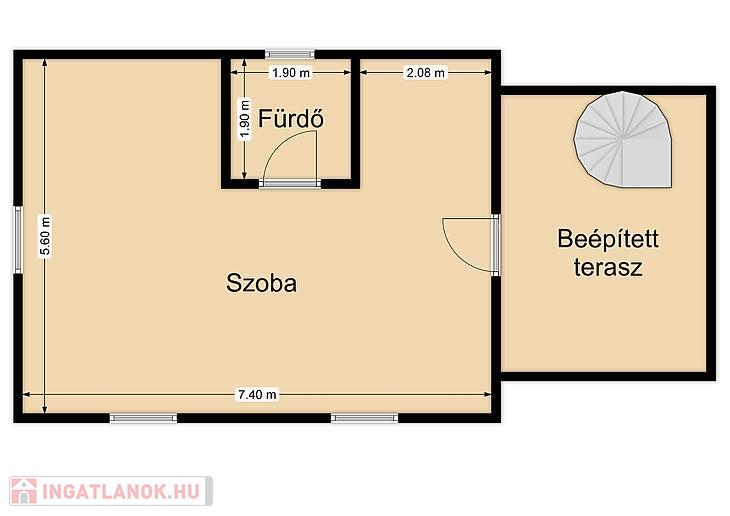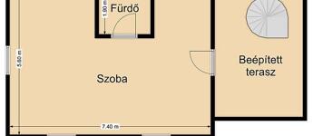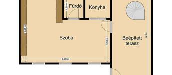 Jelenlegi elosztása a földszinten konyhából, kádas fürdőszobából és egy tágas térből áll, ahol egy térelválasztó könyvespolc és egy egyedi beépített tükrös gardróbszekrény található. A külön bejáratú emelet egy szobából és fürdőből áll, amely még befejezésre vár.
