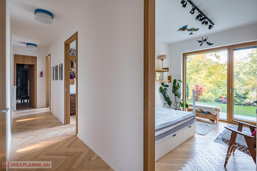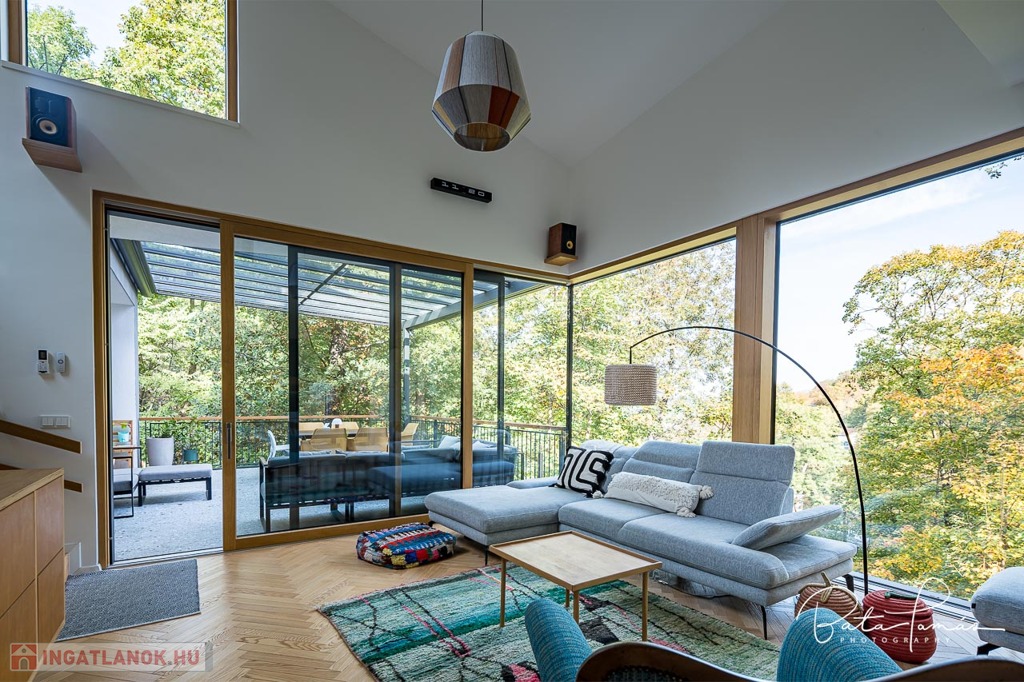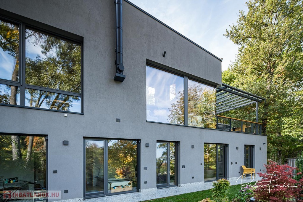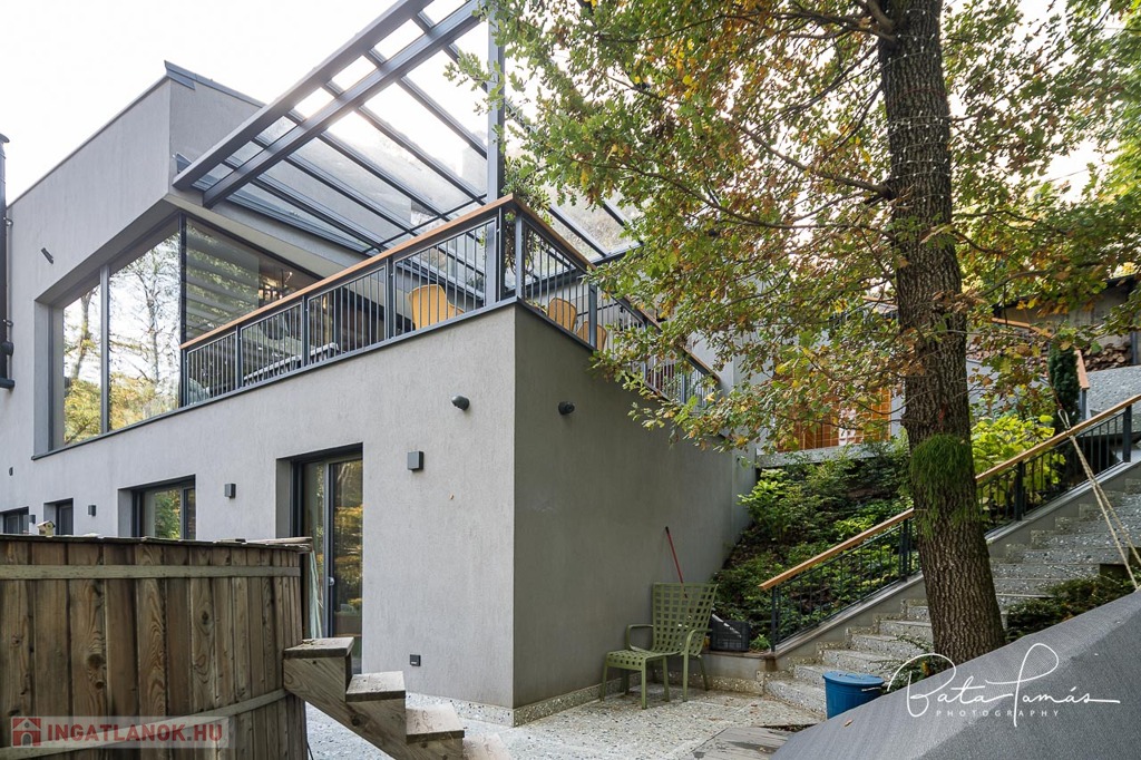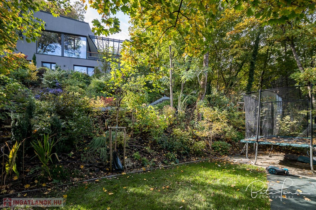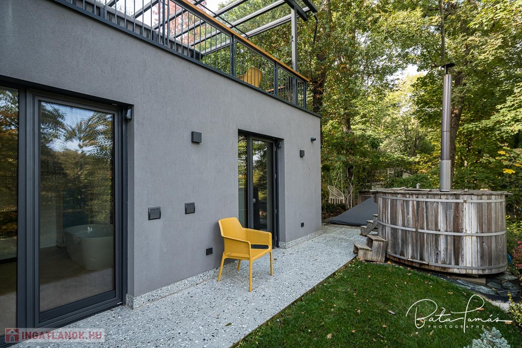 Kivételes természetközeli élmény és magas műszaki tartalom Svábhegy csendes részén! Budapest XII. kerületében, a Svábhegy és Zugliget találkozásánál, csodálatos természeti környezetben, mégis jó tömegközlekedési lehetőségekkel ellátott területen, a Mátyás király út egyik csendes mellékutcájában található ez az újépítésű, modern ikerház. Az ingatlan nyugodt zöldövezeti panorámával, ideális alaprajzzal és modern külső megjelenéssel bír. Az épületet 500 m²-es botanikus kert övezi, egzotikus növényekkel beültetve, amely a gyermekek számára homokozót és trambulint is kínál. Az épület formatervezése tökéletesen illeszkedik a telek természetes domborzatához. Az ingatlan összesen 222 m² nettó lakóterülettel rendelkezik, két teljes értékű szinten, amelyekhez egy 66 m²-es napozó és pihenőterasz is kapcsolódik szaunával és kültéri zuhanyzóval. Minden szobából közvetlen kijárat nyílik a kertbe. A szülői hálószobából elérhető egy fafűtésű dézsafürdő, amely biztosítja a természetközeli felfrissülést. Az impozáns méretű, nagy belmagasságú nappali-konyha-étkező tér lenyűgöző panorámával és hatalmas üvegfelületekkel teremt egyedi, szinte lombház-szerű élményt, amely harmonikusan egyesíti a belső és külső tereket. Az ingatlan minden apró részletét a tulajdonos gondos tervezése és kivitelezése tükrözi, a minőségi anyaghasználat és a felsőkategóriás műszaki megoldások pedig a maximális komfortot szolgálják. Műszaki jellemzők: • 25 cm külső hőszigetelés • Mennyezeti hűtés-fűtés és padlófűtés helyiségenkénti szabályozással, távoli elérhetőséggel (Rehau) • Szintenként egyedi tervezésű, fa tüzelésű cserépkályha • Háromrétegű, biztonsági üvegezéssel ellátott nagyméretű tölgy nyílászárók, alumínium burkolattal, motoros redőnyökkel és szúnyoghálókkal (Schlotterer) • Központi időkapcsolós, külmotoros szellőztető rendszer • Csúcskategóriás konyhai gépek: Bosch főzőlap, sütő, mosogatógép, hűtőszekrény, Electrolux borhűtő • Vízlágyító és tisztító berendezés • Magas minőségű szaniterek és csaptelepek (Laufen, Hansgrohe) • Gira kapcsolók és konnektorok • 9 rétegű valódi kőrisfa parketta (padlófűtés kompatibilis) • Háromfázisú elektromos autótöltési lehetőség • Távfelügyeletre kötött, magas szintű biztonsági rendszer (éjjellátó kamerák, infra csapdák, mozgásérzékelők) Helyiségek elrendezése: • Nappali szint: Tágas előtér, gardrób, amerikai konyhás nappali-étkező nagy belmagassággal, kamra, vendég mosdó, 66 m²-es, zavartalan használatot biztosító terasz nyári konyhával és napozó résszel. • Hálószoba szint: Három tágas hálószoba, egy dolgozószoba, járható gardróbszoba és két fürdőszoba. Az épülethez tartozik egy garázs, valamint egy felszíni beállóhely is. Ez a páratlan ingatlan kivételes természeti környezetben, magas szintű kényelmet és otthonosságot biztosít, ahol minden készen áll a beköltözésre.