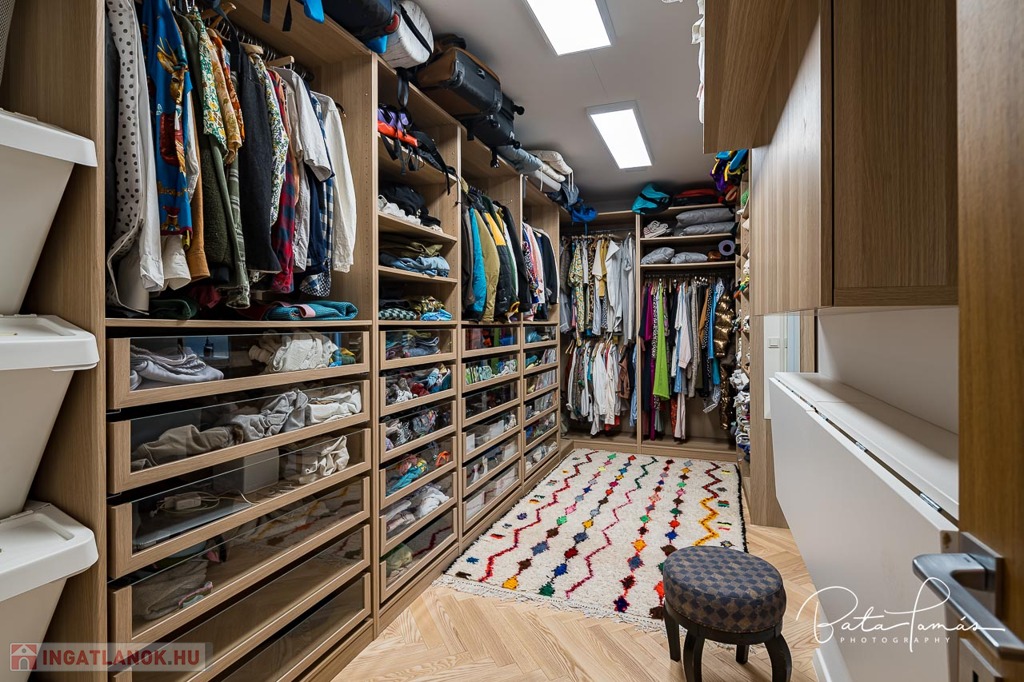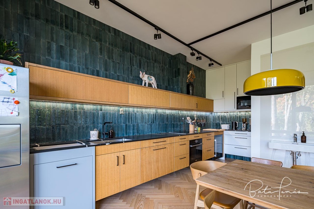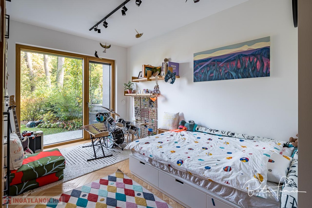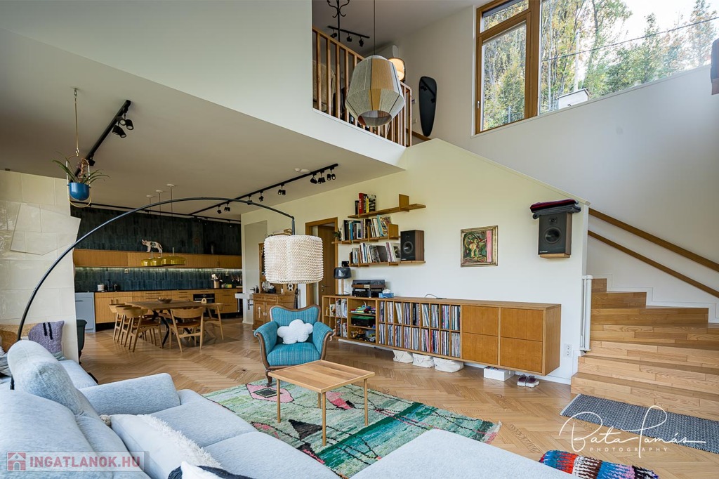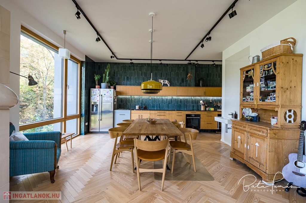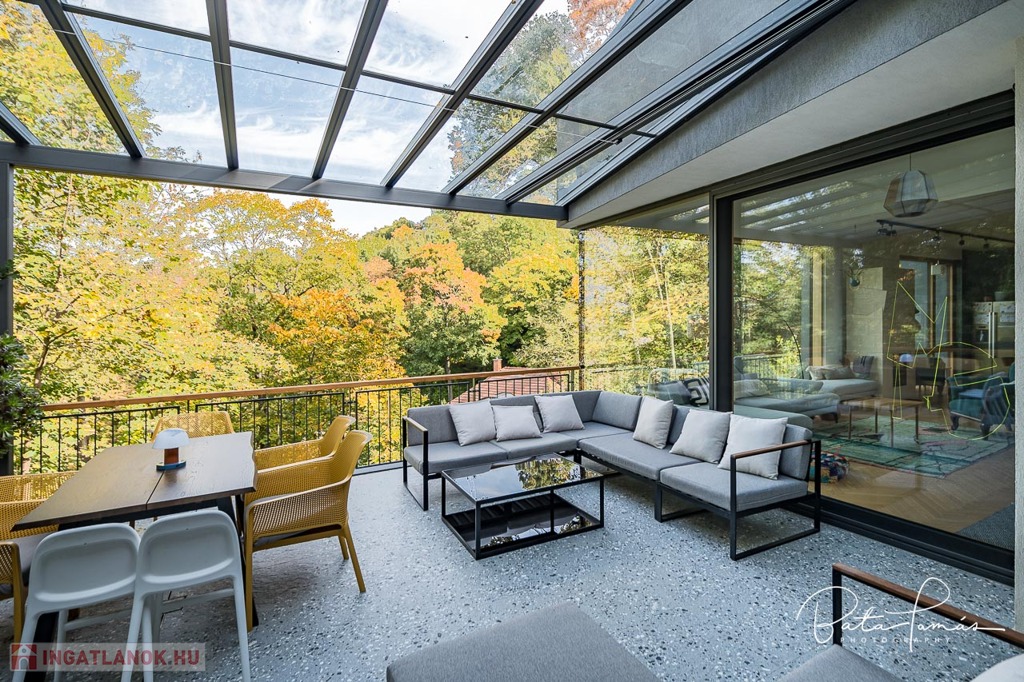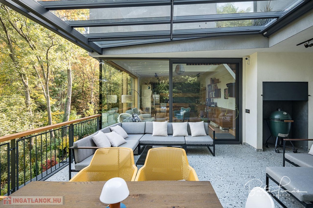 Kivételes természetközeli élmény és magas műszaki tartalom Svábhegy csendes részén! Budapest XII. kerületében, a Svábhegy és Zugliget találkozásánál, csodálatos természeti környezetben, mégis jó tömegközlekedési lehetőségekkel ellátott területen, a Mátyás király út egyik csendes mellékutcájában található ez az újépítésű, modern ikerház. Az ingatlan nyugodt zöldövezeti panorámával, ideális alaprajzzal és modern külső megjelenéssel bír. Az épületet 500 m²-es botanikus kert övezi, egzotikus növényekkel beültetve, amely a gyermekek számára homokozót és trambulint is kínál. Az épület formatervezése tökéletesen illeszkedik a telek természetes domborzatához. Az ingatlan összesen 222 m² nettó lakóterülettel rendelkezik, két teljes értékű szinten, amelyekhez egy 66 m²-es napozó és pihenőterasz is kapcsolódik szaunával és kültéri zuhanyzóval. Minden szobából közvetlen kijárat nyílik a kertbe. A szülői hálószobából elérhető egy fafűtésű dézsafürdő, amely biztosítja a természetközeli felfrissülést. Az impozáns méretű, nagy belmagasságú nappali-konyha-étkező tér lenyűgöző panorámával és hatalmas üvegfelületekkel teremt egyedi, szinte lombház-szerű élményt, amely harmonikusan egyesíti a belső és külső tereket. Az ingatlan minden apró részletét a tulajdonos gondos tervezése és kivitelezése tükrözi, a minőségi anyaghasználat és a felsőkategóriás műszaki megoldások pedig a maximális komfortot szolgálják. Műszaki jellemzők: • 25 cm külső hőszigetelés • Mennyezeti hűtés-fűtés és padlófűtés helyiségenkénti szabályozással, távoli elérhetőséggel (Rehau) • Szintenként egyedi tervezésű, fa tüzelésű cserépkályha • Háromrétegű, biztonsági üvegezéssel ellátott nagyméretű tölgy nyílászárók, alumínium burkolattal, motoros redőnyökkel és szúnyoghálókkal (Schlotterer) • Központi időkapcsolós, külmotoros szellőztető rendszer • Csúcskategóriás konyhai gépek: Bosch főzőlap, sütő, mosogatógép, hűtőszekrény, Electrolux borhűtő • Vízlágyító és tisztító berendezés • Magas minőségű szaniterek és csaptelepek (Laufen, Hansgrohe) • Gira kapcsolók és konnektorok • 9 rétegű valódi kőrisfa parketta (padlófűtés kompatibilis) • Háromfázisú elektromos autótöltési lehetőség • Távfelügyeletre kötött, magas szintű biztonsági rendszer (éjjellátó kamerák, infra csapdák, mozgásérzékelők) Helyiségek elrendezése: • Nappali szint: Tágas előtér, gardrób, amerikai konyhás nappali-étkező nagy belmagassággal, kamra, vendég mosdó, 66 m²-es, zavartalan használatot biztosító terasz nyári konyhával és napozó résszel. • Hálószoba szint: Három tágas hálószoba, egy dolgozószoba, járható gardróbszoba és két fürdőszoba. Az épülethez tartozik egy garázs, valamint egy felszíni beállóhely is. Ez a páratlan ingatlan kivételes természeti környezetben, magas szintű kényelmet és otthonosságot biztosít, ahol minden készen áll a beköltözésre.