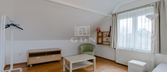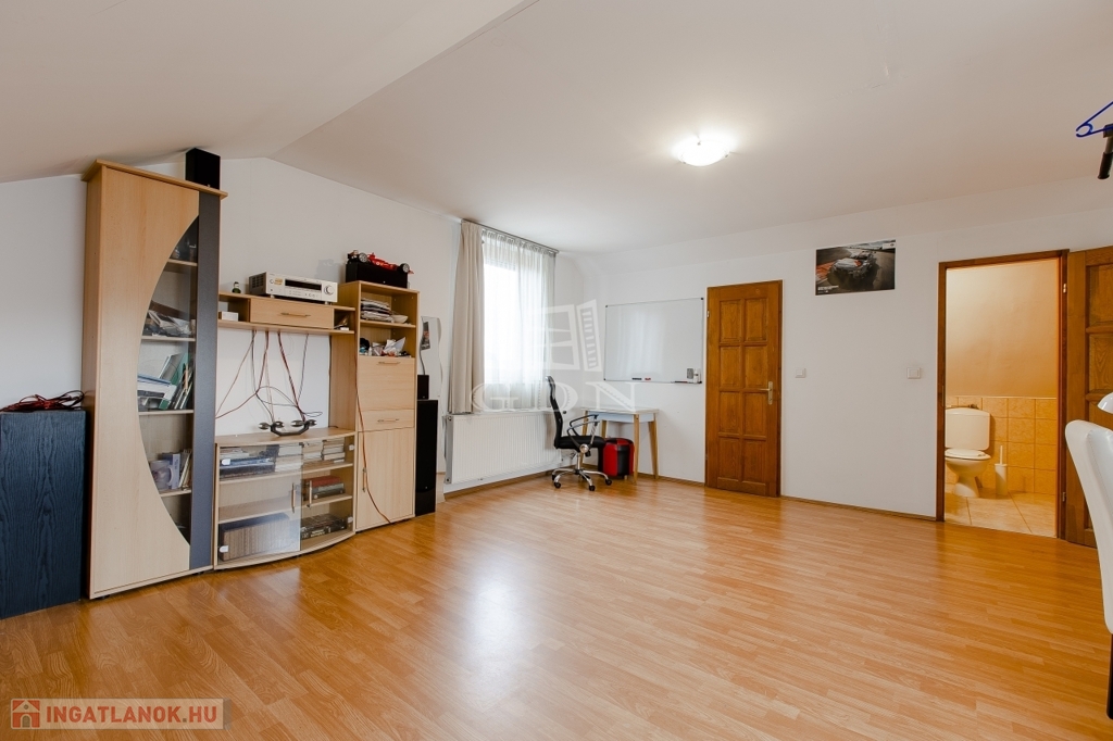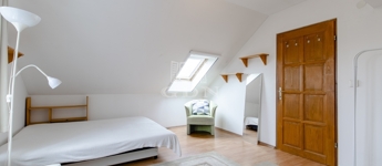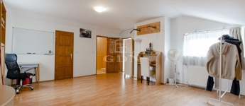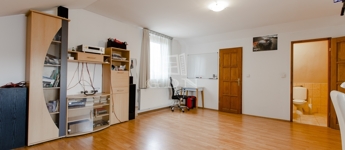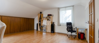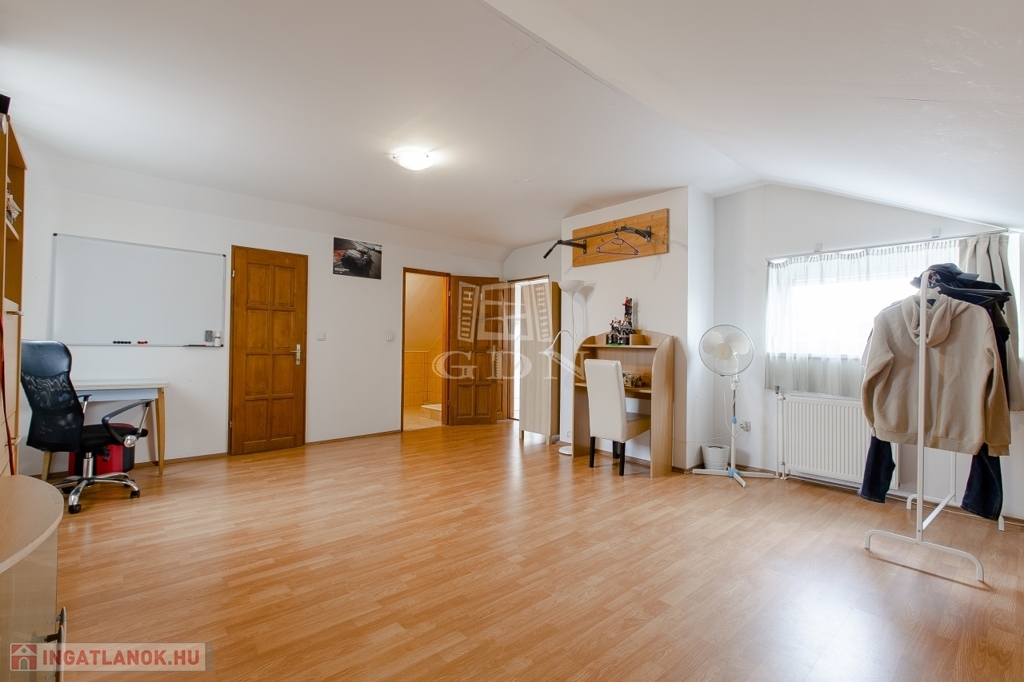 Szintén a közlekedőből jutunk fel a beépített teljes értékű tetőtérbe, ahol ki lett alakítva 2 db külön nyíló szoba, gardrób helyiség és egy zuhanyzós fürdőszoba. A nagyszoba további lehetőségeket rejt magába, szinte bárhogy lehet alakítani, akár 2 db szobává is.