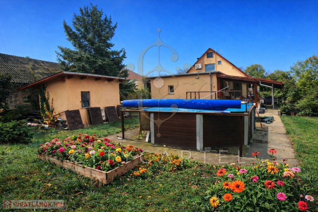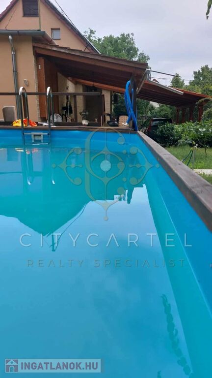 A gépkocsibeálló és terasztető igényes fa burkolatú. Hátul 6x4 nm-es hűszivattyús kültéri medence, köves szalonnasütő.