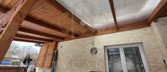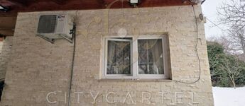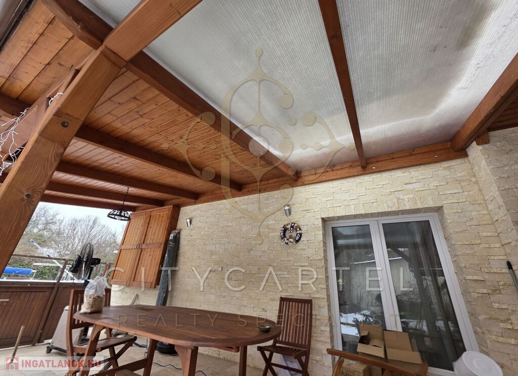 A ház kívülről 10 cm-es szigetelést kapott, alapja tört márvány. Két autó részére fedett beálló, de még legalább négy autóbeállási lehetőség. A bejárat mellett tágas, fedett terasz található.