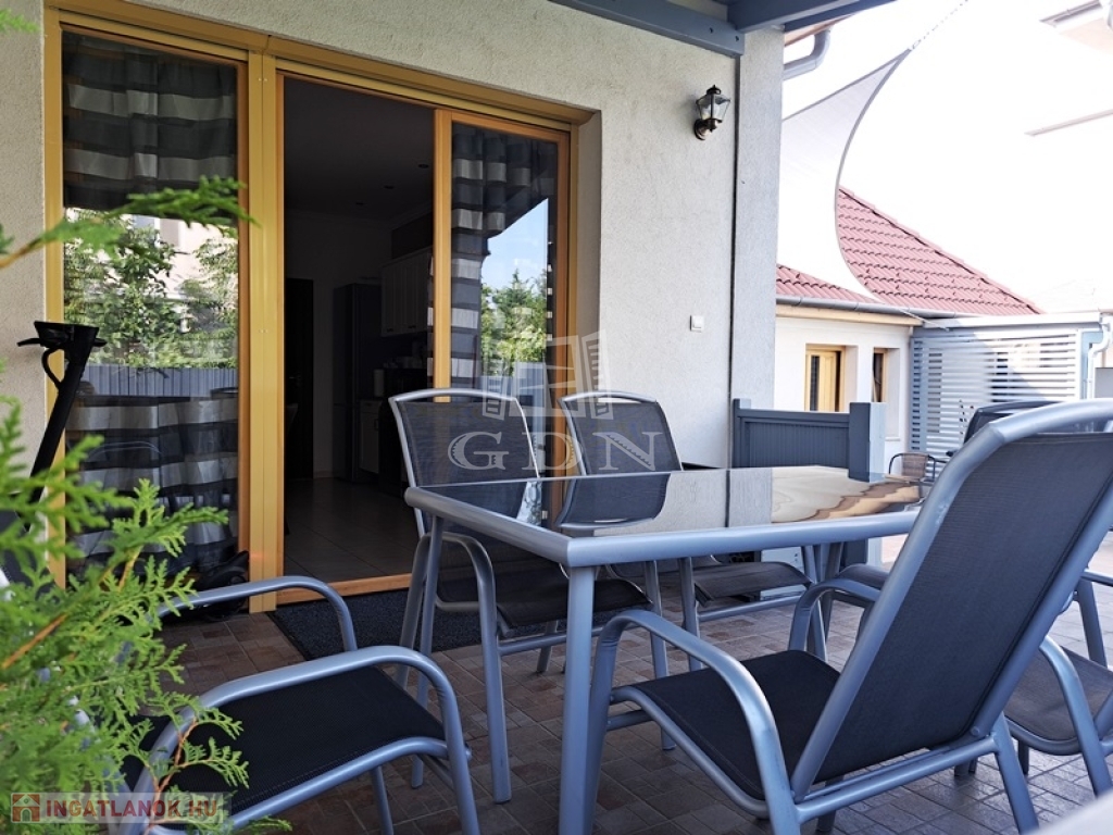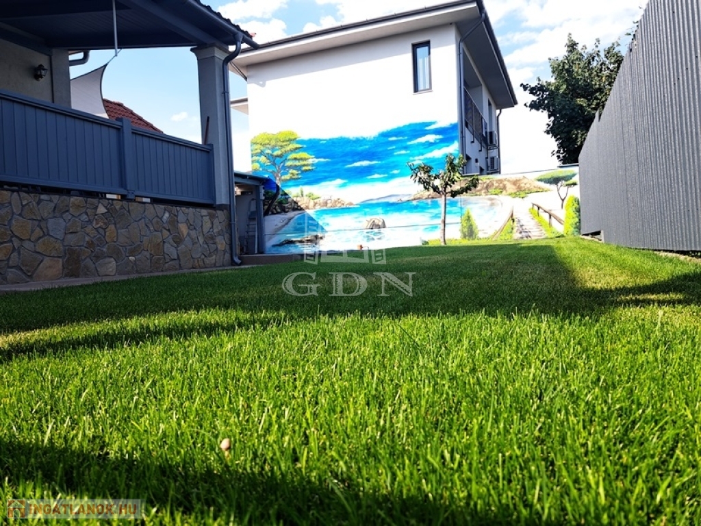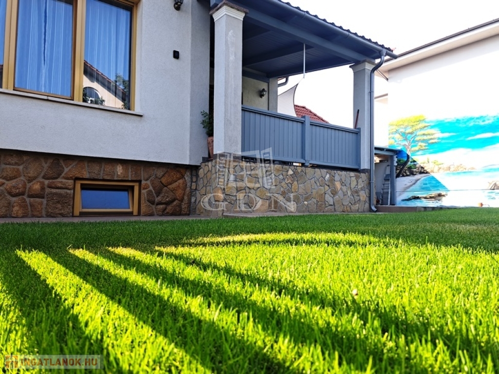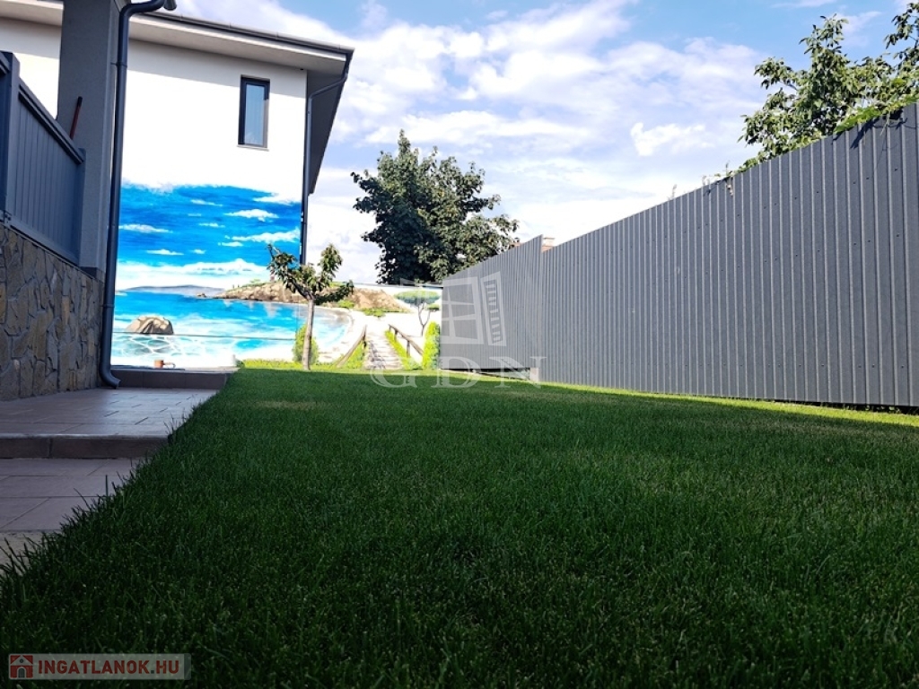 Az intim kert rendezett parkosított, két autó számára fedett autóbeálló áll rendelkezésre.A kert öntözését fúrt kút biztosítja.