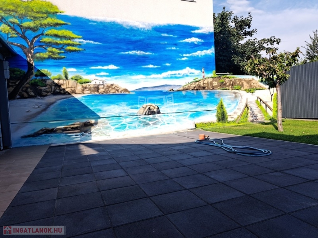-kert rendezés, (gyepszőnyeg, falfestmény, terasz burkolat, kapu automatizálás, kaputelefon)