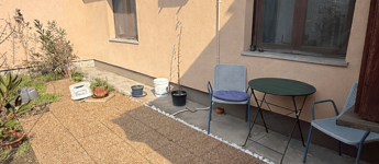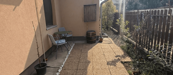 A lakáshoz tartozik egy kerítéssel leválasztott, saját használatú, 110 m²-es terasz, amely kiváló lehetőséget biztosít pihenésre, kertészkedésre, grillezésre vagy családi, baráti összejövetelekre.