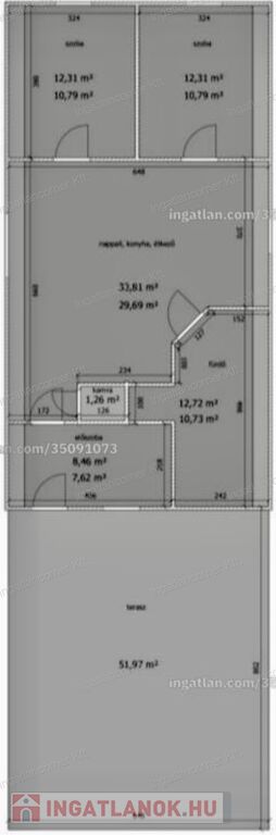 Remek kialakítás, az 52nm teraszról léphetünk a lakásba mely áll előszoba, am. konyha-étkező-nappali, 2 szoba, fürdőszoba-wc, kamra.