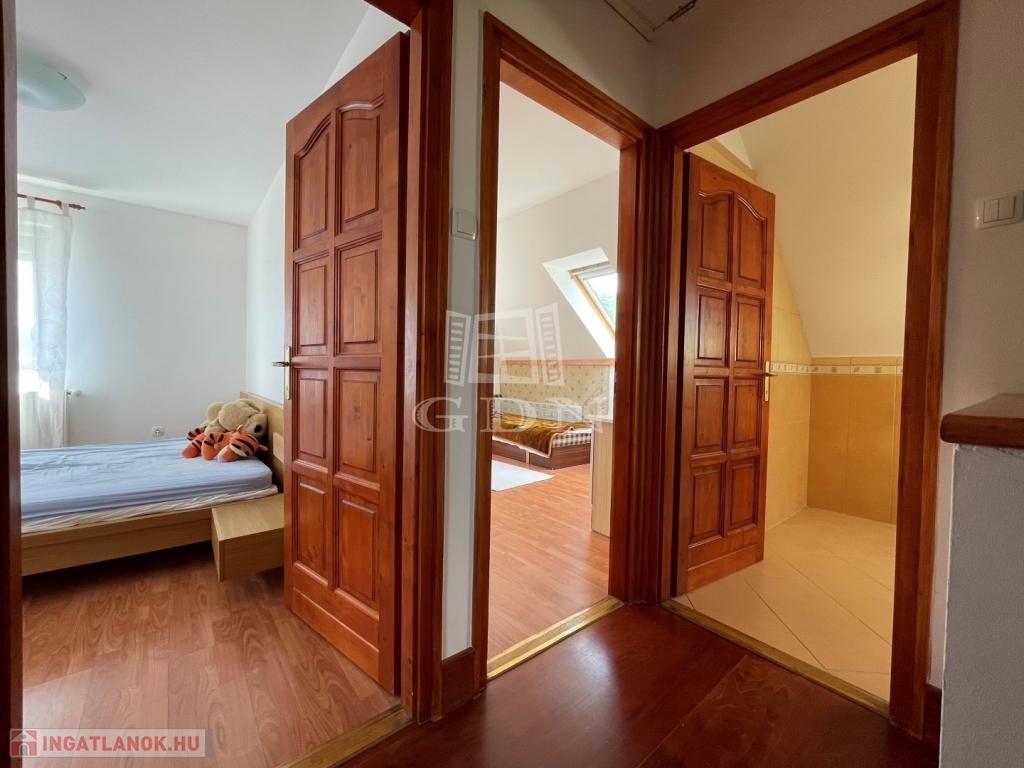 - Tetőtér: Egy tágas falépcső vezet az emeletre, amely tetőtér: egy kisebb előtérről nyílik a 3 szoba, hatalmas fürdőszoba sarokkáddal, WC, bidé.
