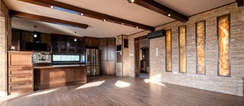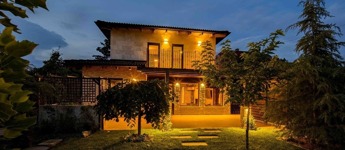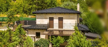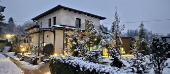 Monolit vasbeton szerkezet, 44 centis Porotherm tégla + hőszigetelő vakolat, az emelet 43, a földszint a félemeleti szobával és fürdővel 122, a pince a vendégszobával 56, a nappaliterasz 40 m2.