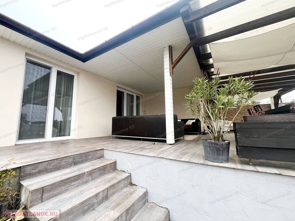 A fedett teraszon pergola alatt feszített víztükrű, dupla motoros jacuzzi található, saját puffertartállyal – az ár részét képezi.