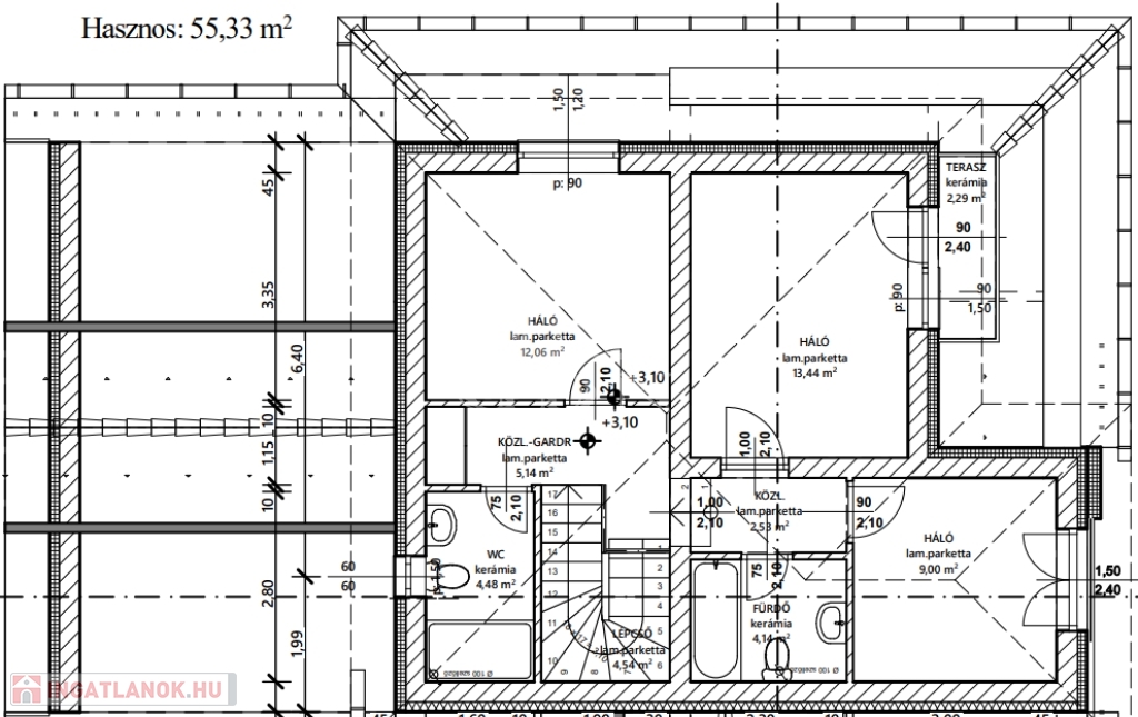 • 5,14 m2-es közlekedő- 4,54 m2 lépcsőtér