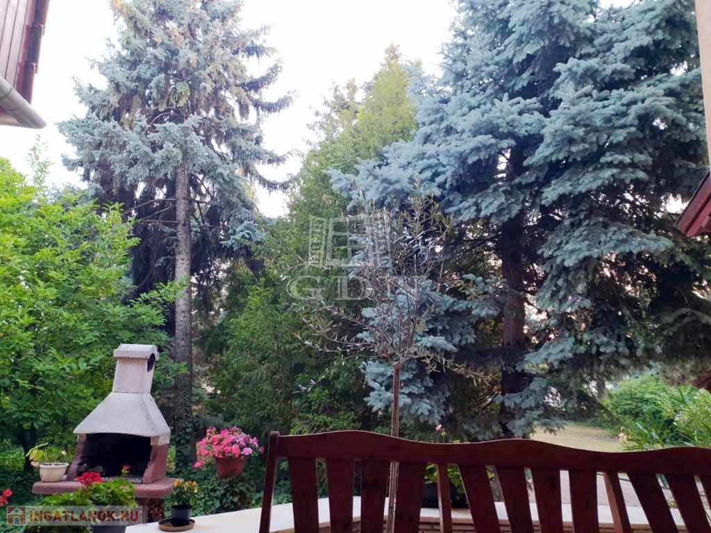 A házhoz három terasz tartozik, melyek gyönyörű kilátást nyújtanak a parkosított kertre, ahol számos fenyőfa és más növény található, amelyek még hangulatosabbá teszik a környezetet.