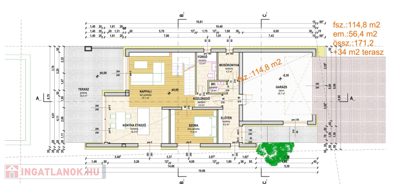 A ház nettó alapterülete 135 nm + 36 nm garázs, 34nm terasz.