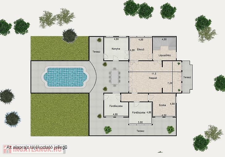 A 110 nm-es terasz kényelmes teret biztosít a pihenésre és kikapcsolódásra. Itt található a 4 x12 m-es (1,5m mélységű) medence is. A jól átgondolt kialakítás része egy a medence használathoz kialakított, közvetlenül megközelíthető fürdőszoba.