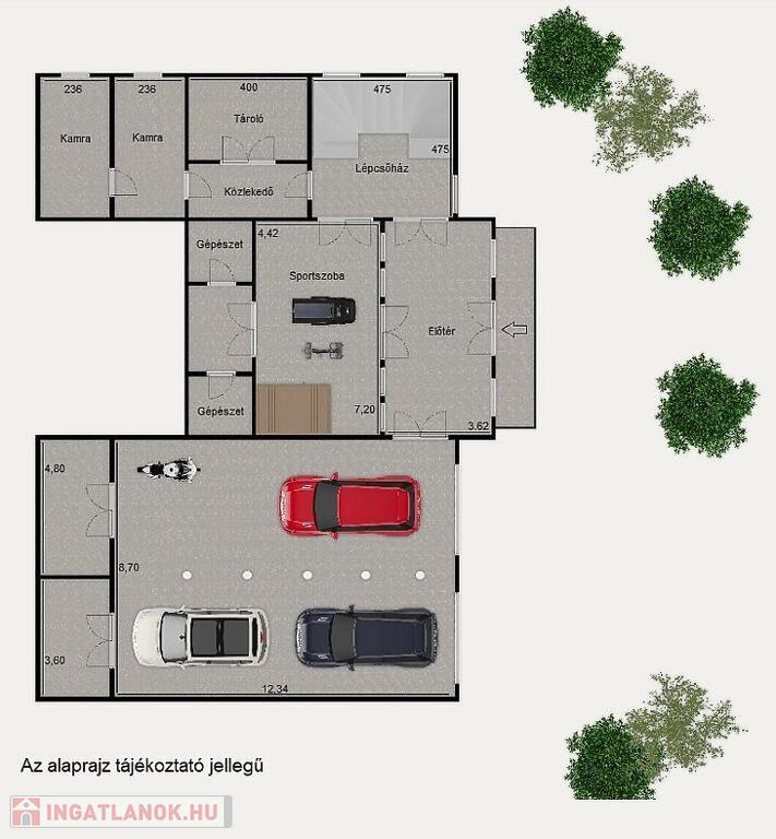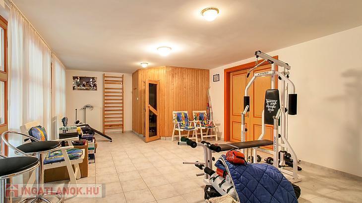 A bejárati szinten (233nm) találjuk a tágas előteret, a szaunával is felszerelt sportszobát, a gépészeti helységeket, tárolókat, kamrákat és a 107 nm-es, 4 autót is kényelmesen befogadó garázst.