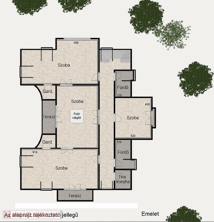 Az emeleti szinten, 4 tágas, napos hálószoba ( 30- 30- 36- és 11 nm ), 2 fürdőszoba, 2 terasz, és egy teakonyha található.