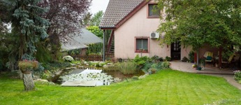 A házhoz egy kényelmes, fedett terasz tartozik, a gondozott kert kitűnő lehetőséget nyújt a pihenésre, kikapcsolódásra, gyönyörködhetünk a halastó és a növények látványában. A kert végében egy kis szerszámok tárolására alkalmas házikó található.