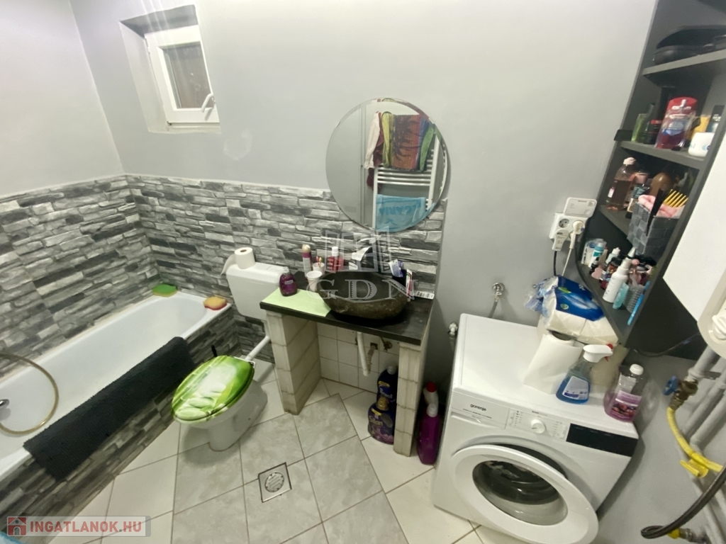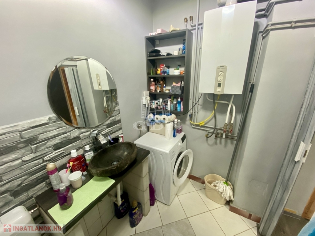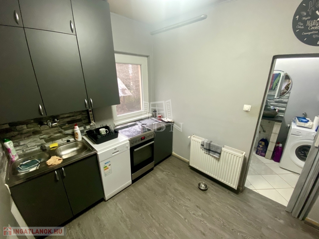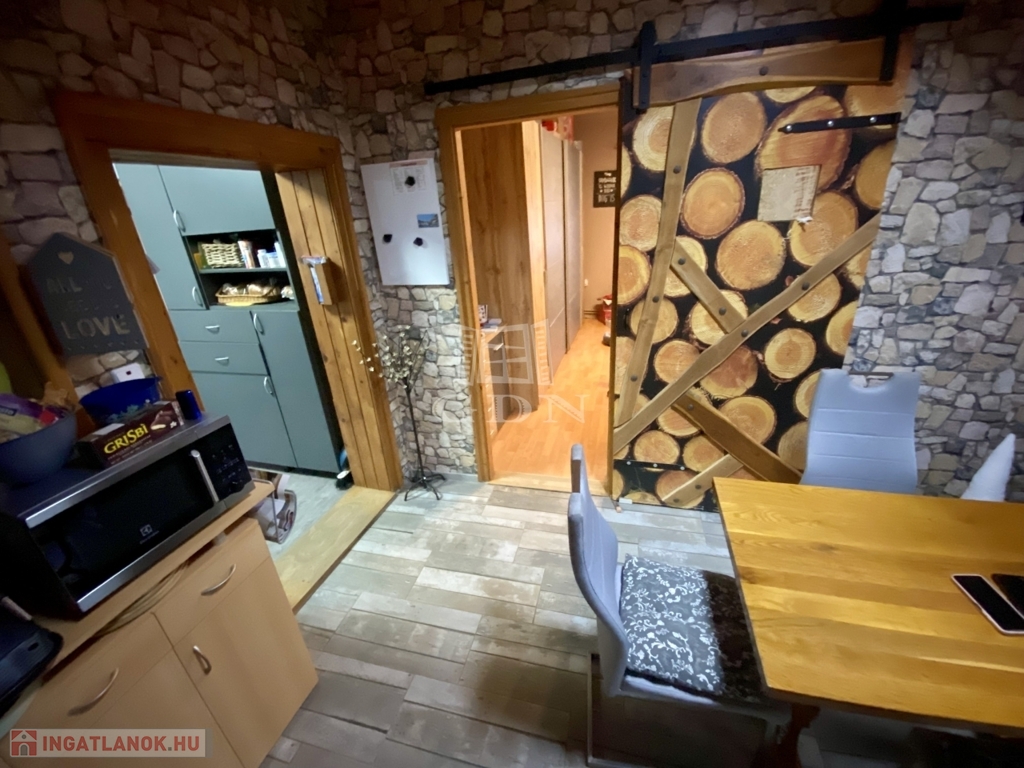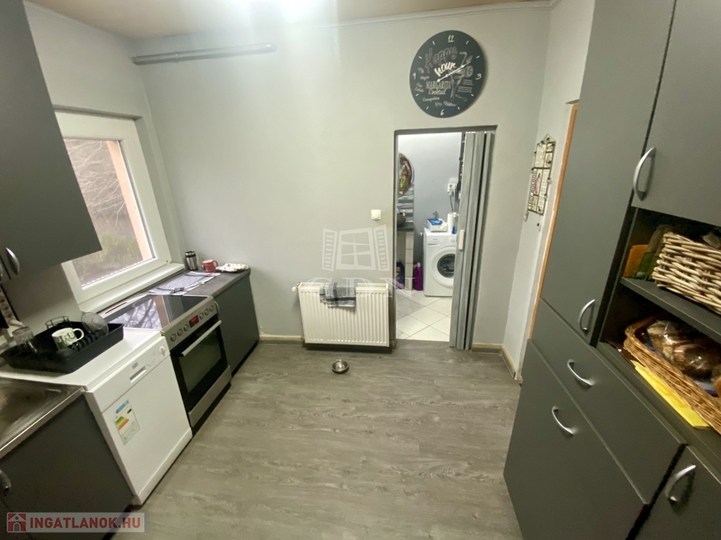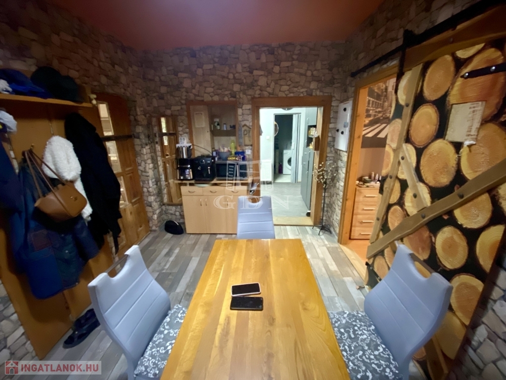 A teraszról az előszobába lépve került kialakításra az étkező, ahonnan nyílik egy szoba, illetve a konyha, melyben iparossal, egyedileg méretre készített konyhabútor található. A konyhából nyílik a fürdőszoba illetve még egy szoba. A fűtést gáz cirkó rendszer biztosítja.